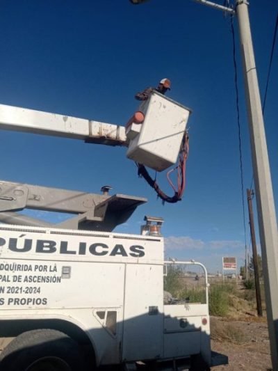 Ascensión. – El gobierno municipal encabezado por la alcaldesa, Lic. Ivonne De La Hoya Venzor, a través de la dirección de servicios públicos a cargo del Ing. Juan Porras Cárdenas, da continuidad a los trabajos de reparación y/o rehabilitación de luminarias con la finalidad de contar con localidades más iluminadas y en mejores condiciones.